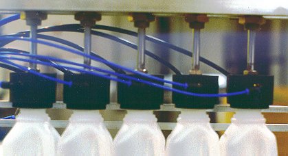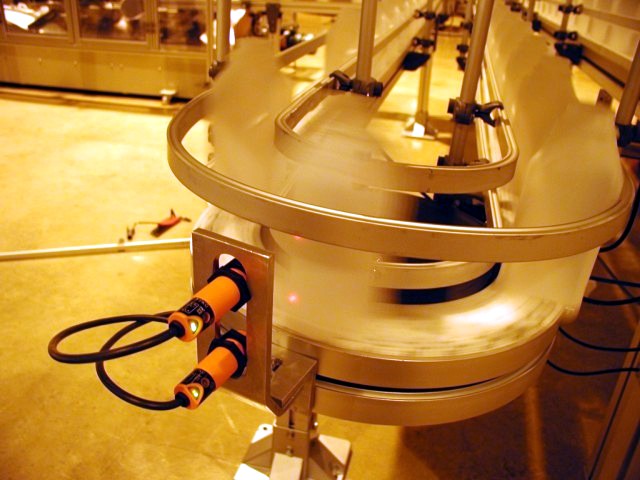 As the bottle travels along the conveyor, it passes through a modulated infra red light beam. The absorption of the beam is measured and used to test the wall thickness. This can be used to detect wall thickness variations, blown in necks, etc. The system was designed for natural plastic (e.g. milk bottles) but may be suitable for other applications.